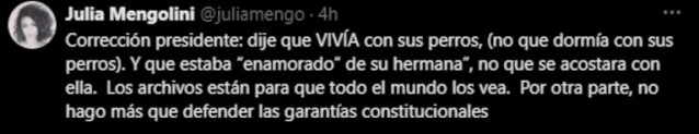 Después de que se viralizara el tuit del jefe de Estado, Julia Mengolini no dudó en salir al cruce. “Corrección presidente: dije que VIVÍA con sus perros, (no que dormía con sus perros). Y que estaba ‘enamorado de su hermana’, no que se acostara con ella”, expuso.