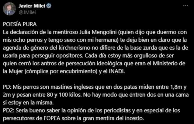“Poesía pura: la declaración de la mentirosa de Julia Mengolini (quien dijo que duermo con mis ocho perros y tengo sexo con mi hermana) te deja bien en claro que la agenda de género del kirchnerismo no difiere de la base zurda que es la de usarla para perseguir opositores”, expresó el mandatario en referencia a la postura política de la periodista.