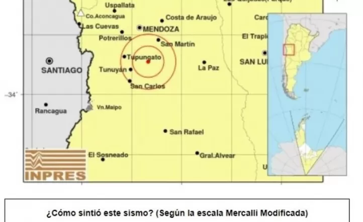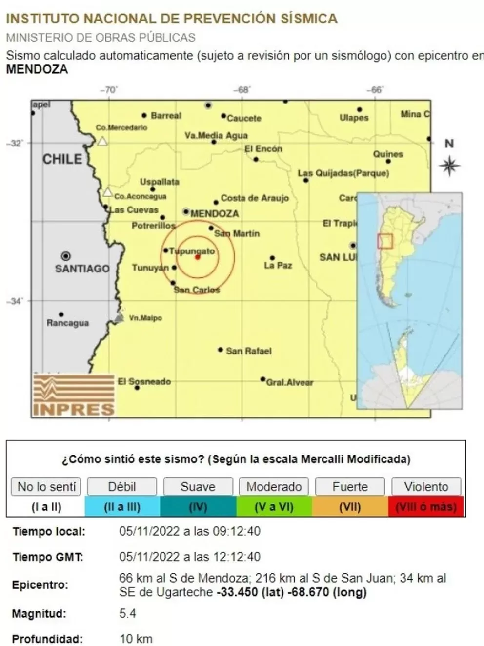 En la mañana de este sábado, pasadas las 9 horas, la provincia de Mendoza se vio afectada por un sismo de 5,4 grados de magnitud. De acuerdo con lo publicado por el Instituto Nacional de Prevención Sísmica (Inpres), el movimiento tuvo lugar a 56 kilómetros al sur de la ciudad capital y su profundidad fue de 2 kilómetros.