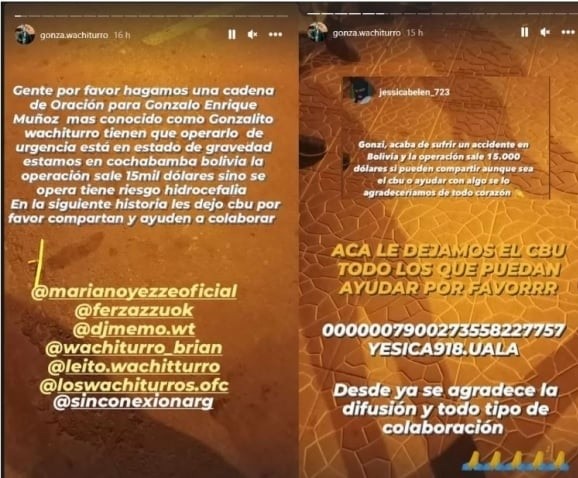 “Hagamos una cadena de oración por Gonzalito, está en estado de gravedad, estamos en Cochabamba. Si no se opera tiene riesgo hidrocefalia“, dicen los integrantes de Los Wachiturros desde la cuenta del cantante.