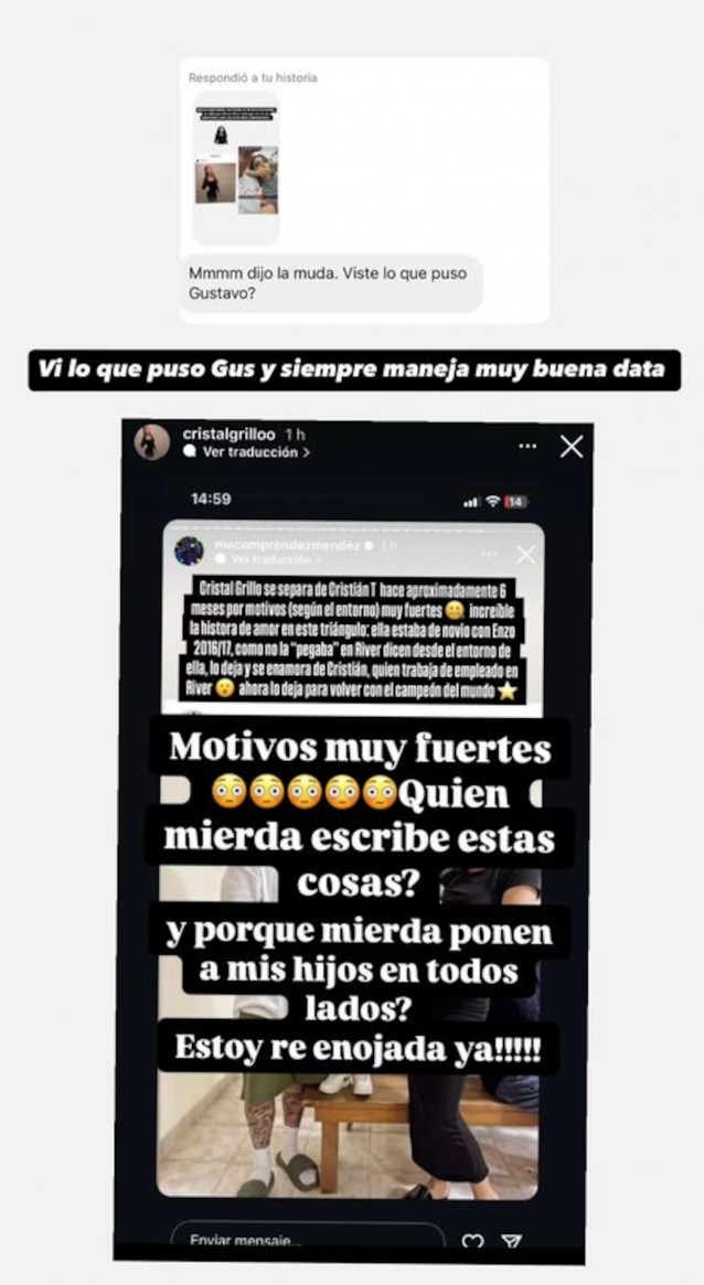 Al ver esta publicación, la modelo decidió romper el silencio y se mostró realmente molesta por los trascendidos. “¿Motivos muy fuertes? ¿Quién m... escribe estas cosas? ¿Por qué ponen a mis hijos en todos lados? ¡Estoy re enojada ya!”, lanzó en su cuenta de Instagram.