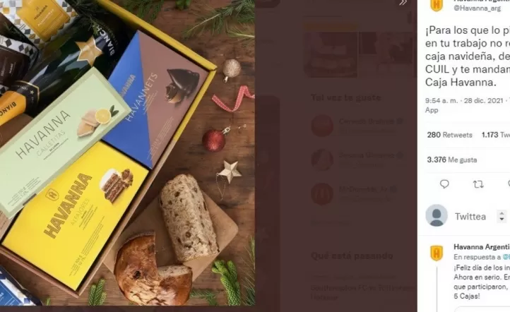 "¡Para los que lo pidieron! Si en tu trabajo no recibiste caja navideña, dejanos tu CUIL y te mandamos una Caja Havanna", aseguraron en la cuenta de Twitter de la tradicional firma argentina, a las 9.45.