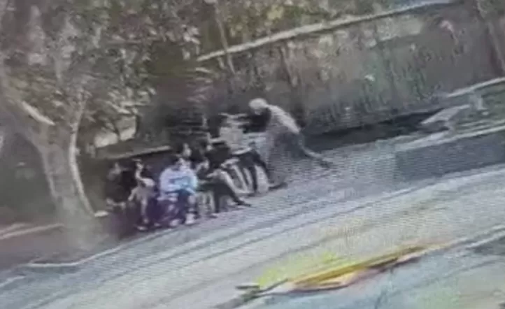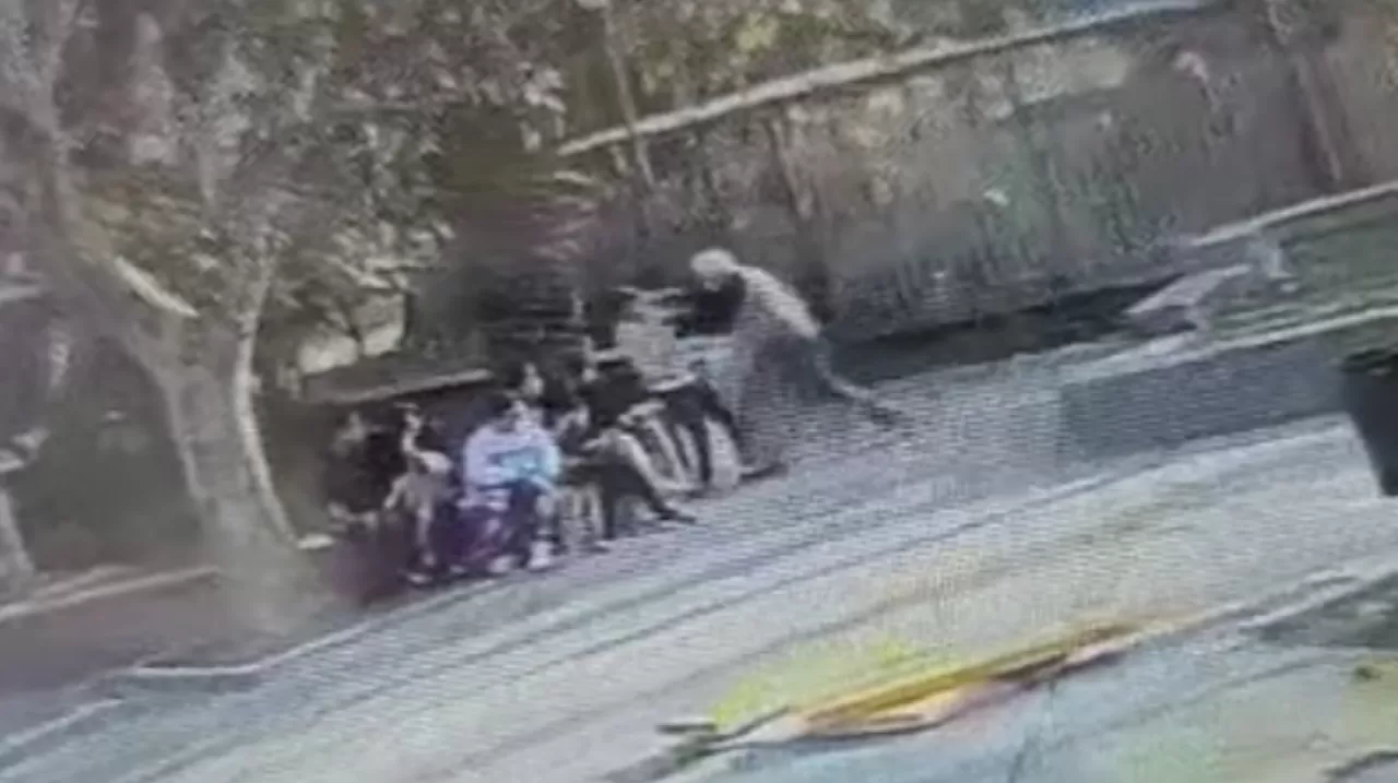 A los minutos, se puede ver cómo el hombre sale de su casa con lo que parece un objeto punzante en la mano y luego, ya en la plaza, se abalanza sobre dos de los menores, Ramiro y una chica, y los golpea. Mientras la chica logra zafarse rápidamente, Ramiro es quien recibe más zamarreos por parte del adulto.