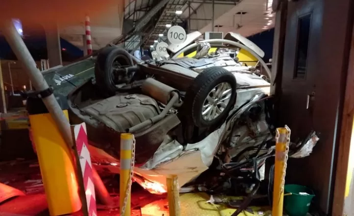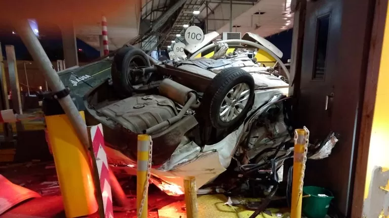 Por razones que todavía se estaban investigando, la víctima impactó a varios kilómetros por hora contra un Peugeot 408 que estaba haciendo la fila para cruzar el peaje, destrozó una de las cabinas de cobro y terminó completamente volcado sobre el asfalto.