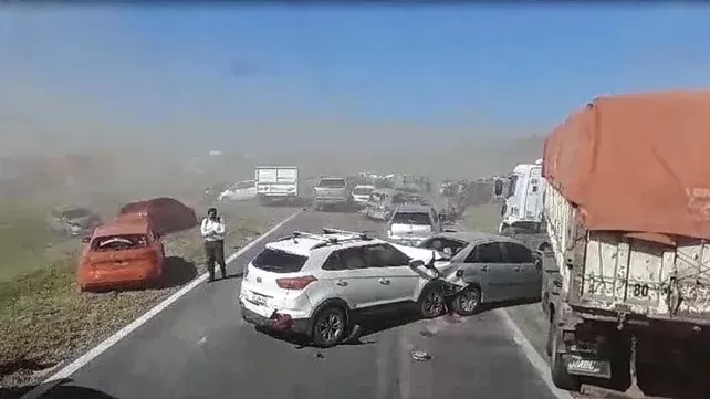 El grave accidente se produjo alrededor de las 14.40 de este lunes, en el kilómetro 330 de la autopista, en ambas manos. En ese momento, la región era azotada por una fuerte tormenta de viento y tierra, que dejó sin visibilidad a los conductores. "La visibilidad es nula por la tormenta de tierra, es un peligro realmente", precisó una automovilista que fue testigo del choque en el programa “La primera de la tarde” (Radio 2).