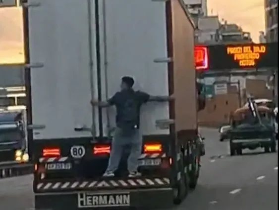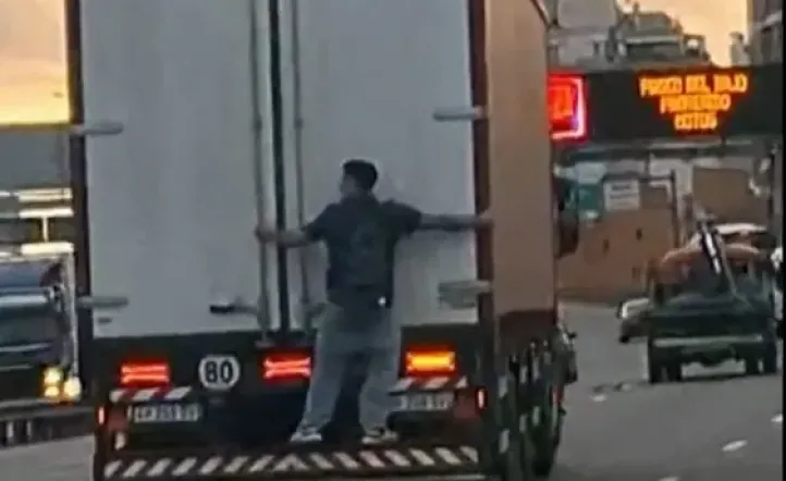 Una escena insólita fue registrada este viernes por la mañana en la autopista 25 de Mayo, donde una joven captó a un hombre viajando colgado de un camión. Ocurrió en las primeras horas del día, en sentido hacia la autopista Buenos Aires–La Plata.