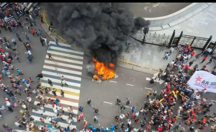 Los violentos aprovecharon la ausencia policial y pronto tomaron la avenida Entre Ríos, donde quemaron neumáticos y un contenedor de basura. Según mostraron imágenes de TN, manifestantes quemaron neumáticos que llevaban escondidos en bolsas de plástico negras.