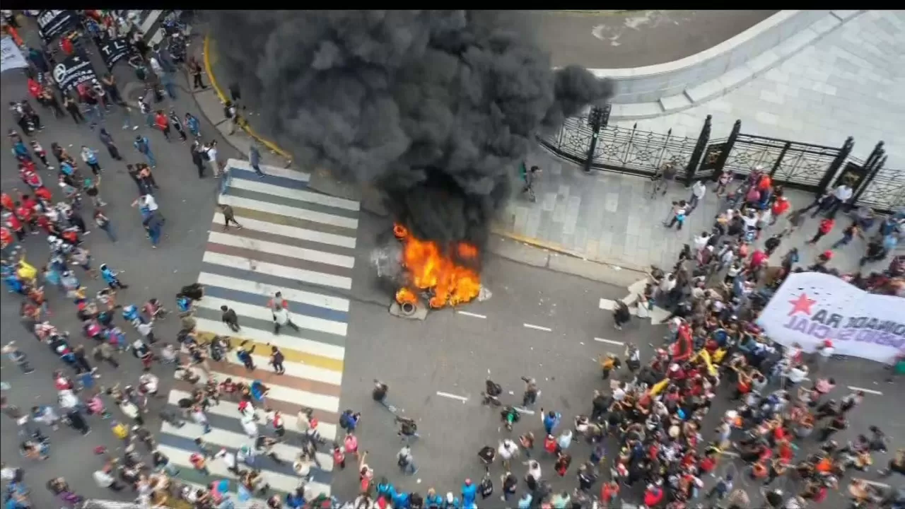 Los manifestantes violentos se reagruparon en medio de la Plaza de los Dos Congresos y comenzaron a prender fuego contenedores. Se trató de entre 30 a 40 personas que lanzaron cascotes y botellas contra los efectivos. La policía respondió con balas de goma en medio de un caos generalizado.