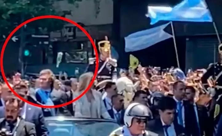 Los videos muestran con claridad cómo una persona que caminaba por la vereda lanza una botella desde el costado derecho y pasa a escasos centímetros del Jefe de Estado y de Karina Milei.