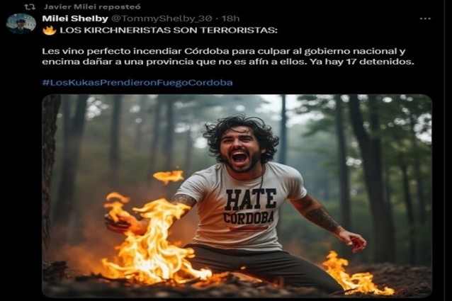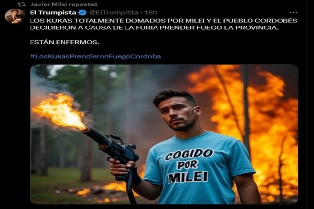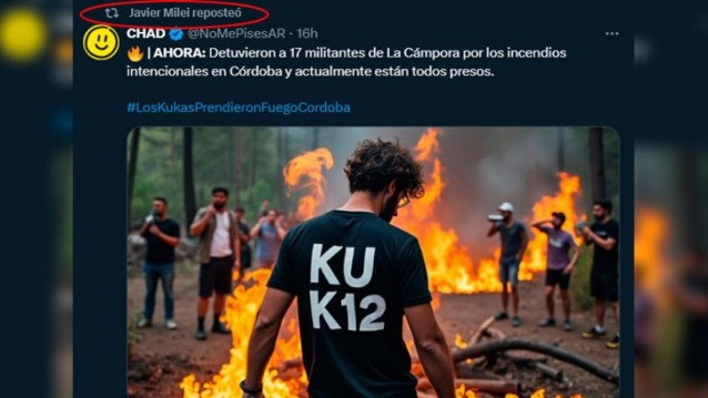 La fake news había sido instalada ayer por una serie de cuentas libertarias, en coincidencia con la visita oficial a la zona incendiada. "Los 'kukas' totalmente domados por Milei y el pueblo cordobés decidieron prender fuego la provincia, están enfermos", posteó El Trumpista en X usando el hashtag con el que se instaló la versión falsa en las redes #LosKukasPrendieronFuegoCordoba. Fue uno de los mensajes que retuiteó el mandatario y que esta mañana habían tenido más de 50 mil vistas.