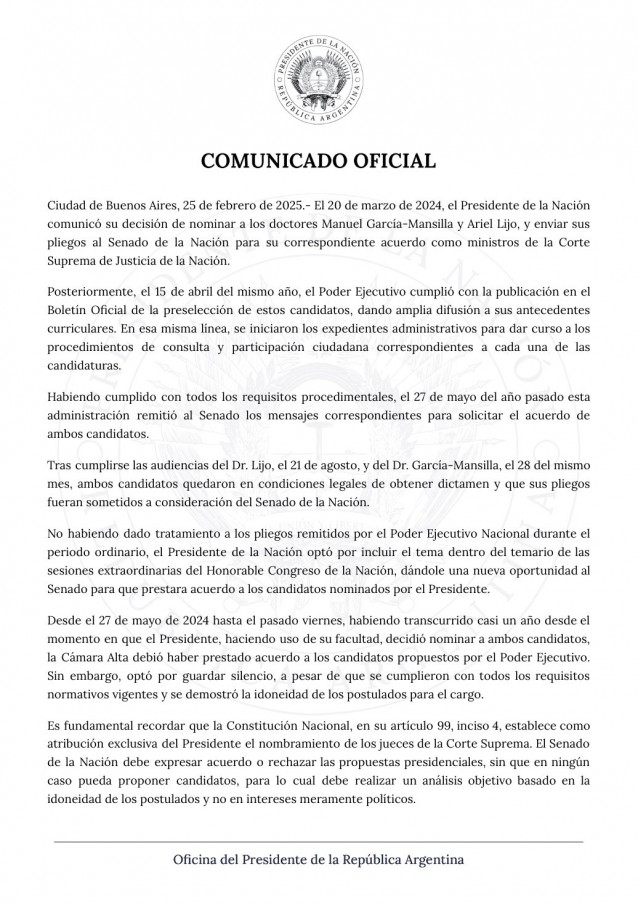 “El Presidente ha tomado la determinación de designar en comisión a los doctores Manuel García-Mansilla y Ariel Lijo como jueces de la Corte Suprema de Justicia de la Nación, hasta la finalización del próximo período legislativo, con el objetivo de normalizar el funcionamiento del máximo tribunal judicial de nuestro país, el cual no puede llevar a cabo su ml con normalidad con tan solo tres ministros. Durante el mencionado plazo, esta administración continuará con el trámite legislativo para que la Cámara Alta ejerza sus atribuciones y preste los correspondientes acuerdos a los pliegos. El Gobierno Nacional no tolera ni tolerará que los intereses de la política se impongan por sobre los del pueblo argentino, bajo ninguna circunstancia”.