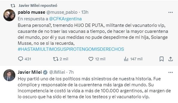 En la misma publicación, Milei compartió el mensaje de Pablo Musse, padre de Solange, quien falleció en agosto de 2020 y a quien no pudo despedir debido a las restricciones de viaje impuestas por las autoridades, que le impidieron trasladarse desde Neuquén a Córdoba para verla. Solange, de 35 años, padecía cáncer en ese momento.