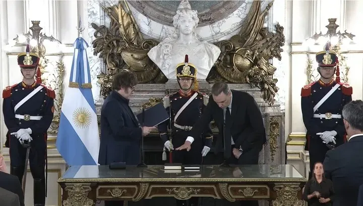 El presidente Javier Milei le tomó juramento este miércoles a su flamante jefe de Gabinete, Manuel Adorni. Fue luego de una reunión que el mandatario encabezó en Casa Rosada con más de 100 legisladores, en busca de su apoyo en el Congreso para aprobar una serie de reformas clave, como por ejemplo laboral, tributaria y penal.
