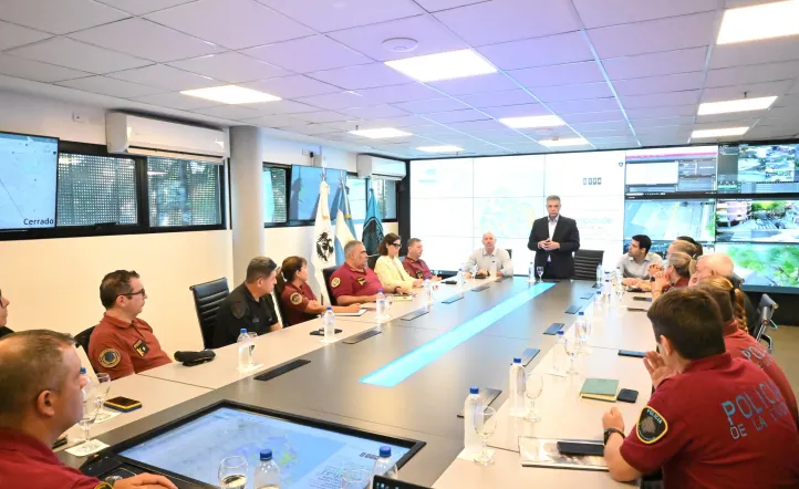 El Jefe de Gobierno respaldó a la Policía porteña en su “enorme mayoría” en la reunión en el Centro de Monitoreo Urbano de Chacarita. Lo acompañaron la vocera del Gobierno porteño, Laura Alonso; el ministro de Seguridad, Waldo Wolff; el secretario de Seguridad, Ezequiel Daglio; el Jefe de la Policía, Diego Ariel Casaló, y la cúpula de la fuerza.