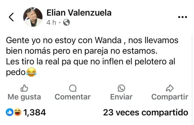 “Gente, yo no estoy con Wanda, nos llevamos bien nomás, peo en pareja no estamos”, aclaró el referente del RKT en su cuenta de Facebook.