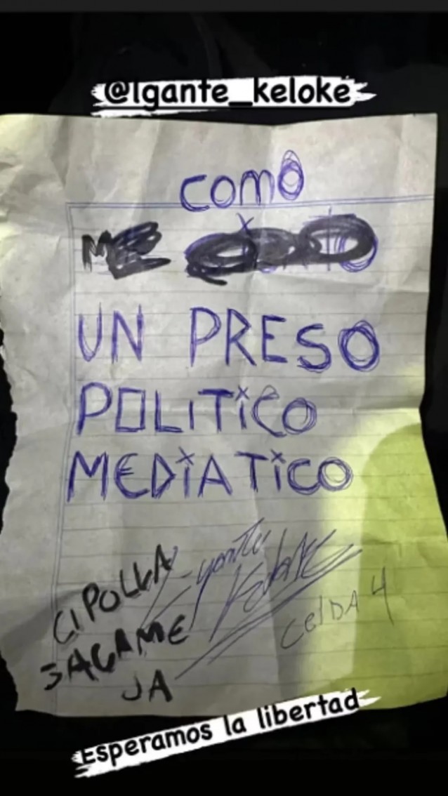 Por otro lado, y con el mismo marcador que había tachado la primera parte, le dejó el contundente mensaje a su abogado: “Cipolla, sácame, ja”.