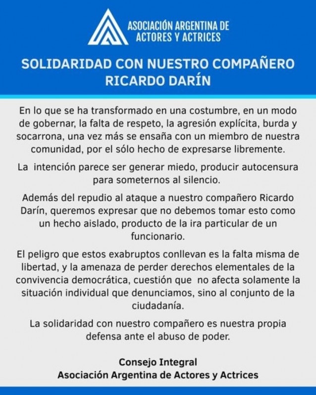 Para finalizar, expresaron su apoyo a Ricardo Darín: "La solidaridad con nuestro compañero es nuestra propia defensa ante el abuso de poder".