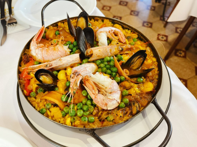 Pero mas allá de lo que entra por los ojos, es lo que llega al estómago lo que remite a la Madre Patria: Pulpo al verdeo, trucha almendra, cóctel de camarones, salmón con salsa gallega, tortilla a la española, lenguado vasca, abadejo valenciana, paella, arroz con mariscos y ensalada de frutos de mar.
