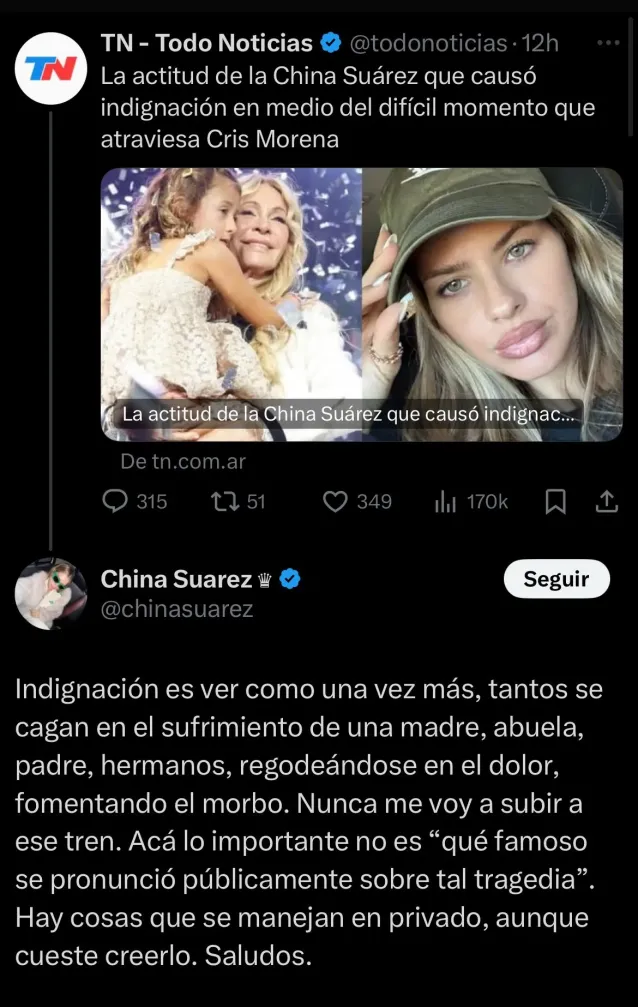 "Indignación es ver cómo una vez más, tantos se cagan en el sufrimiento de una madre, abuela, padre, hermanos, regodeándose en el dolor, fomentando el morbo", comenzó diciendo en un tuit en respuesta a la nota que hizo TN sobre la controversia en redes. Y continuó: "Nunca me voy a subir a ese tren. Acá lo importante no es 'qué famoso se pronunció públicamente sobre tal tragedia'. Hay cosas que se manejan en privado, aunque cueste creerlo. Saludos", concluyó categórica.