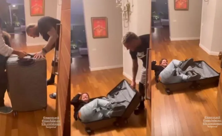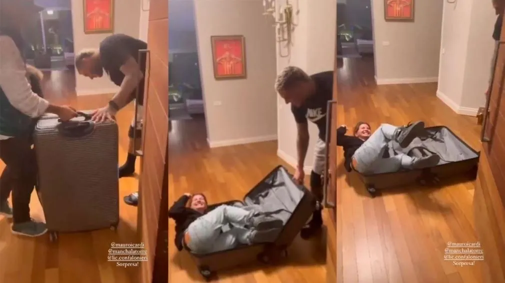 En el video que compartió en las redes sociales muestra cómo sus amigos ingresaron a la propiedad de Icardi con el equipaje y le explicaron que era un regalo. Después de constatar que se trataba de algo muy pesado, Mancha, muy cercano a la China, aclaró: “Se rompió el cierre japonés, bah, chino”. Acto seguido, abrió la valija y mostró a la artista en su interior. Mauro no ocultó su sorpresa y estalló en risas.