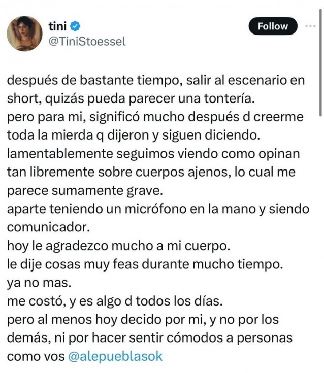 En otra parte del comunicado, Tini reflexionó acerca del proceso que la llevó a estar mejor mentalmente y aceptarse cómo es: “Hoy le agradezco mucho a mi cuerpo. Le dije cosas muy feas durante mucho tiempo. Ya no más”.