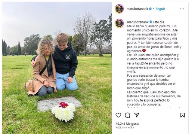 En su publicación, la figura se animó a relatar cómo fue la visita que hizo en los últimos días a la tumba de su hijo que murió en 2008. “Ese día Juani me quiso acompañar y cuando entramos me dijo ´quiero ir a ver a Facu’ . Fue una sensación de amor tan grande verlo buscar la tumba, encontrarla y ni decirles ver el ramo que eligió”