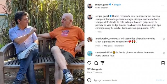 Sergio Gonal publicó un video junto a Ciliberto y lo despidió: "Quiero recordarte de esta manera, Toti querido, siempre intentando generar lo mejor, siempre queriendo hacer, siempre disfrutando de esta vida que hoy nos golpea con tu partida. En vida te dije gracias muchas veces, fuiste un gran tipo conmigo, vos y tu familia. ¡Buen viaje, amigo querido! QEPD".