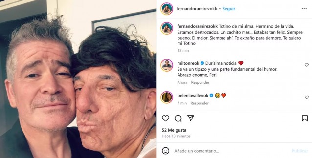 El comediante Fernando Ramírez sumó unas palabras de despedida. “Totino de mi alma. Hermano de la vida. Estamos destrozados. Un cachito más... estabas tan feliz. Siempre bueno. El mejor. Siempre ahí. Te extraño para siempre. Te quiero, mi Totino“.