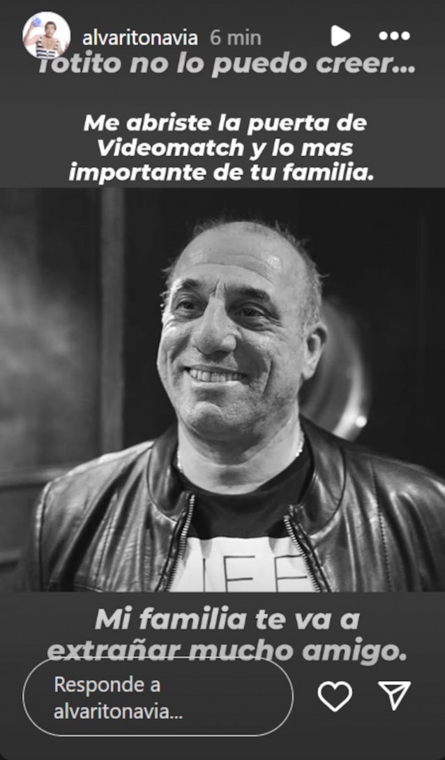 “Totito, no lo puedo creer. Me abriste la puerta de VideoMatch, y lo más importante: de tu familia”, escribió Álvaro Navia en sus redes. “Mi familia te va a extrañar mucho, amigo”, completó.