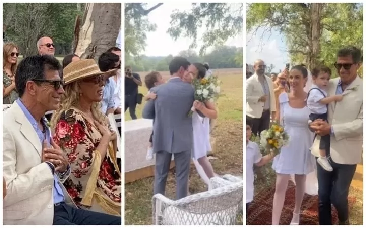 Por su parte, Reina compartió en sus historias diferentes momentos de lo que fue la fiesta que tuvo lugar este sábado en una estancia de Pilar, en la que su hija lució un vestido diseñado por su amigo César Jurisich y hubo algunos invitados famosos como Claudia Albertario y Emiliano Rella, entre otros. Y mostró lo feliz que estaba el novio esperando a su hija en el altar, donde no dejaba de bailar. Hasta que Nicolás se acercó a él, lo saludó y le dio al pequeño Belisario para que lo sostuviera en sus brazos antes de besar apasionadamente a Juana.