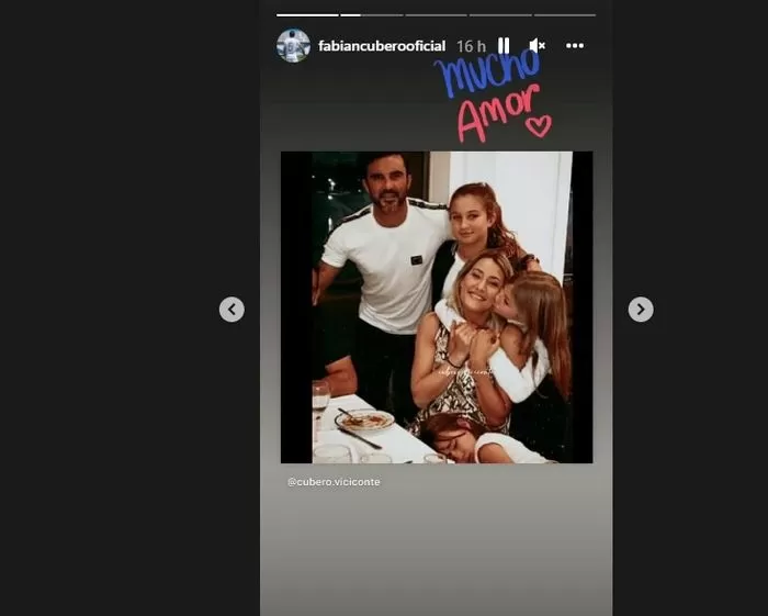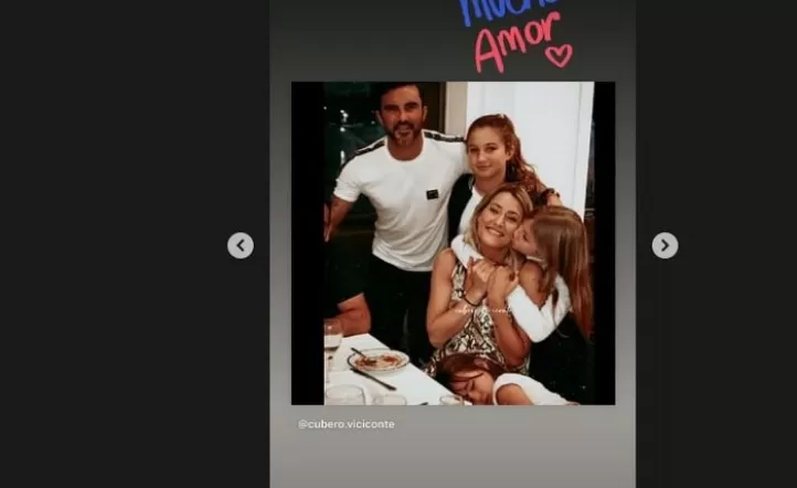En sus historias de Instagram, Fabián Cubero compartió una imagen que alimenta los rumores de embarazo de Mica Viciconte. En la postal se puede ver al ex futbolista y la modelo acompañada por dos de las hijas de él en una mesa: "Mucho amor", reflejó Poroto.