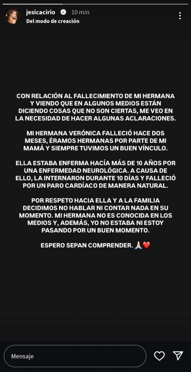 “Con relación al fallecimiento de mi hermana y viendo que en algunos medios están diciendo cosas que no son ciertas, me veo en la necesidad de hacer algunas aclaraciones”, comenzó escribiendo en una historia de Instagram.