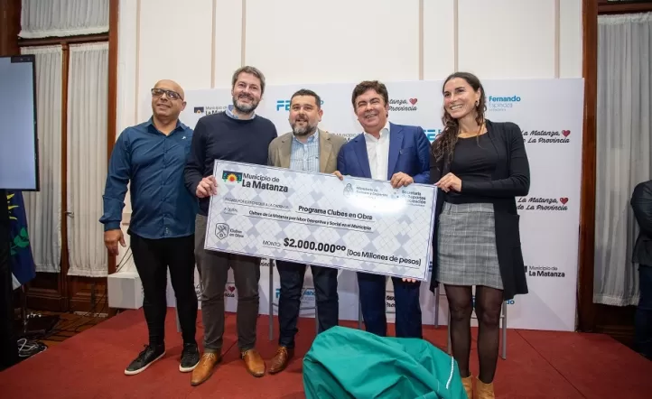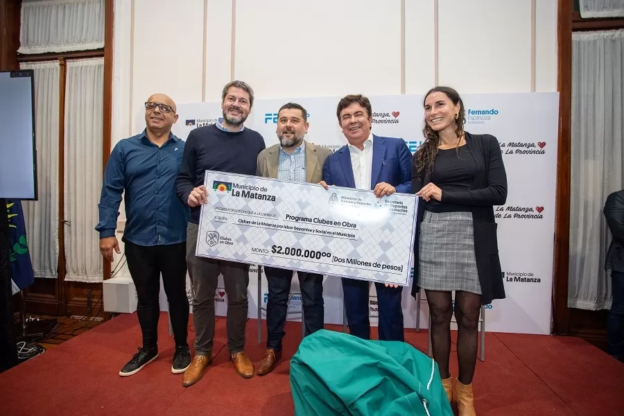 El intendente de La Matanza, Fernando Espinoza, junto con el ministro de Turismo y Deportes de la Nación, Matías Lammens, realizaron la entrega de cheques de apoyo económico por 2 millones de pesos y kits deportivos a distintas instituciones deportivas y clubes de barrio del distrito, que les permitirá realizar mejoras en infraestructura y realizar proyectos de ampliación, refacción y mantenimiento de sus instalaciones; en beneficio de miles de personas que practican actividades deportivas y recreativas en estas instituciones.