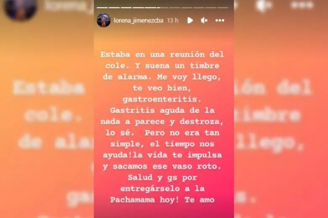 Sin embargo, fue Lorena Jiménez, hija del cantante, quien habló del diagnóstico y detalló la situación que derivó en la intervención quirúrgica, con una relato un tanto distinto al de su hermano. “Me voy, llego, te veo bien, gastroenteritis. Gastritis aguda, de la nada aparece y te destroza, lo sé. Pero no era tan simple, ¡el tiempo nos ayuda! La vida te impulsa y sacamos ese vaso roto. Salud y gracias por entregárselo a la Pachamama hoy. ¡Te amo!”, escribió en su cuenta de Instagram.