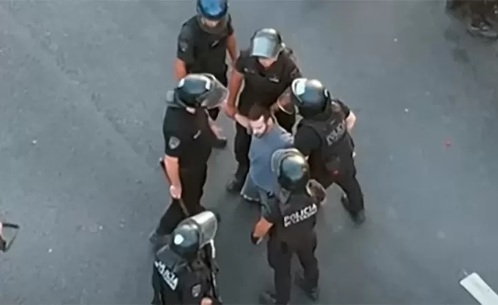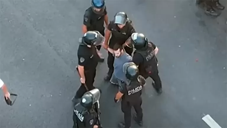 Como respuesta, la Policía de la Ciudad formó un cordón y empezó a avanzar hacia ellos. Un manifestante que se rehusó a marcharse, fue detenido y retirado esposado.