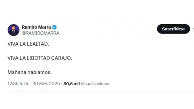 En solo nueve palabras, expresó: “Viva la lealtad. Viva la libertad carajo. Mañana hablamos”, escribió Marra en su cuenta de X, en relación a este jueves. La ampliación de esa respuesta mantiene en vilo al electorado oficialista.