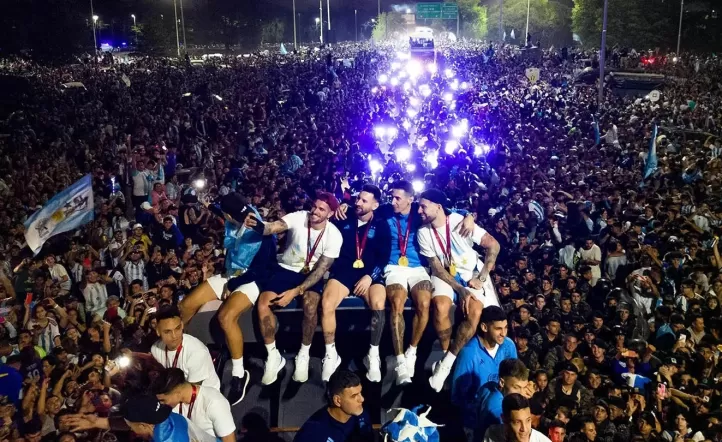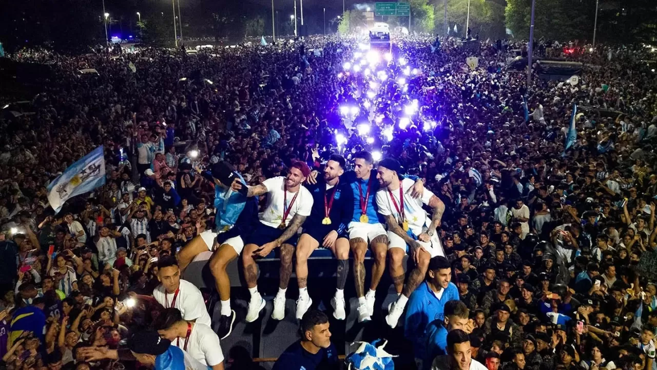 Desde allí, caminaron por una alfombra roja, pasaron por debajo de un arco que decía "Gracias Campeones" y, por último, se subieron al micro descapotable. Salieron por la parte lateral, directo a la autopista Richieri, con destino al predio que tiene la Asociación del Futbol Argentino (AFA) en Ezeiza, donde pasaron la noche.