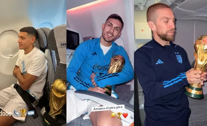 Como se trata de un viaje largo, varios jugadores decidieron mostrar la intimidad del vuelo a través de sus redes sociales. Foto con la tan preciada Copa del Mundo, mucho mate y las ganas de festejar con todos los hinchas.