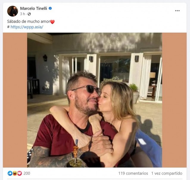“Sábado de mucho amor”, rezaba la imagen de la modelo abrazándolo y dándole un beso. Poco después, se vio otra publicación donde pedía inversiones: “Soy Marcelo Tinelli, representante de la empresa WPP. Estamos teniendo una campaña mediática de $200.000. Vemos que nuestros socios la apoyan mucho. Esperamos recibir comentarios. Sinceramente gracias”.