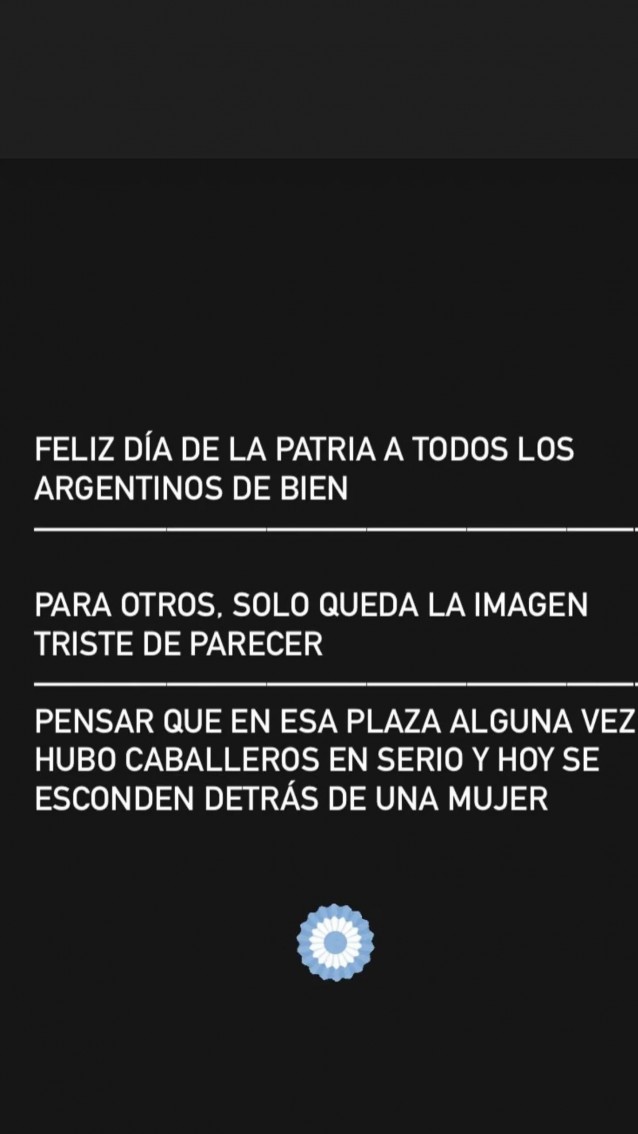 A través de sus historias de Instagram, la conductora hizo un contundente descargo. “Feliz día de la patria a todos los argentinos de bien”, comenzó. Contundente, sumó: “Para otros, solo queda la imagen triste de parecer”.