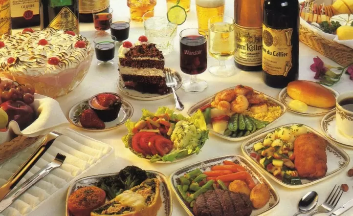 A bordo de los aviones de Air France durante la década de 1950 todo era exageradamente elegante, sobre todo las comidas. Las opciones incluían caviar beluga, ensalada de endivias, medallones de langosta y más. También se ofrecía champagne, vino y todo tipo de licores.