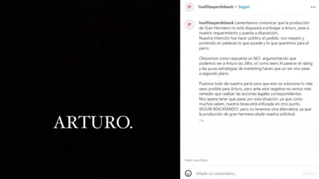 "Lamentamos comunicar que la producción de Gran Hermano no está dispuesta a entregar a Arturo, pese a nuestro requerimiento y puesta a disposición. Nuestra intención fue hacer público el pedido, con respeto y poniendo en palabras lo que sucede y lo que queremos para el perro", expresaron.