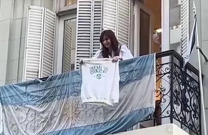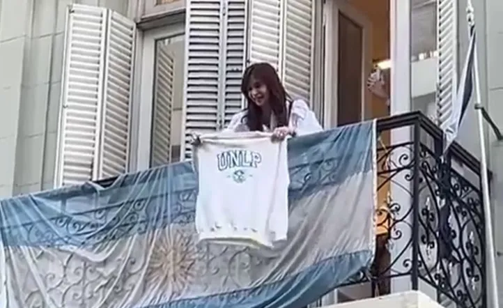 En medio de la marcha universitaria federal, la exmandataria salió al balcón del Instituto Patria, situado en las inmediaciones del Congreso, y exhibió un buzo de la Universidad Nacional de La Plata (UNLP), institución en la que se graduó de la carrera de abogacía, en un claro gesto de apoyo en defensa de la educación pública.