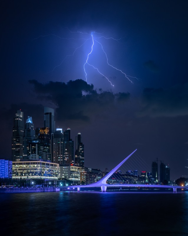 M.B: La de la estación Constitución, por ejemplo, la tomé desde un lugar que durante muchos años soñé con poder subir para hacer esa foto, que es desde una ventana que está a más de veinte metros de altura, donde se tiene una vista increíble del hall principal de la estación. La del Palacio Barolo es una creación digital donde lo teñí de rojo, pero lo interesante de esta foto es que fue de inspiración para el proceso creativo de escritura de la película Vladimira de Diego A. Fleischer, que tendrá como protagonista a Sofía Gala. Y la de Puerto Madero me encanta porque capturé un rayo en una noche de tormenta. Quizás la valoro mucho por la dificultad de tomarla, tanto es así que tomé unas 300 fotos y solo sirvieron cinco o seis. Y te agrego una cuarta, si me permitís, porque considero que es la que resume a Buenos Aires, donde dialoga lo patrimonial con lo actual.