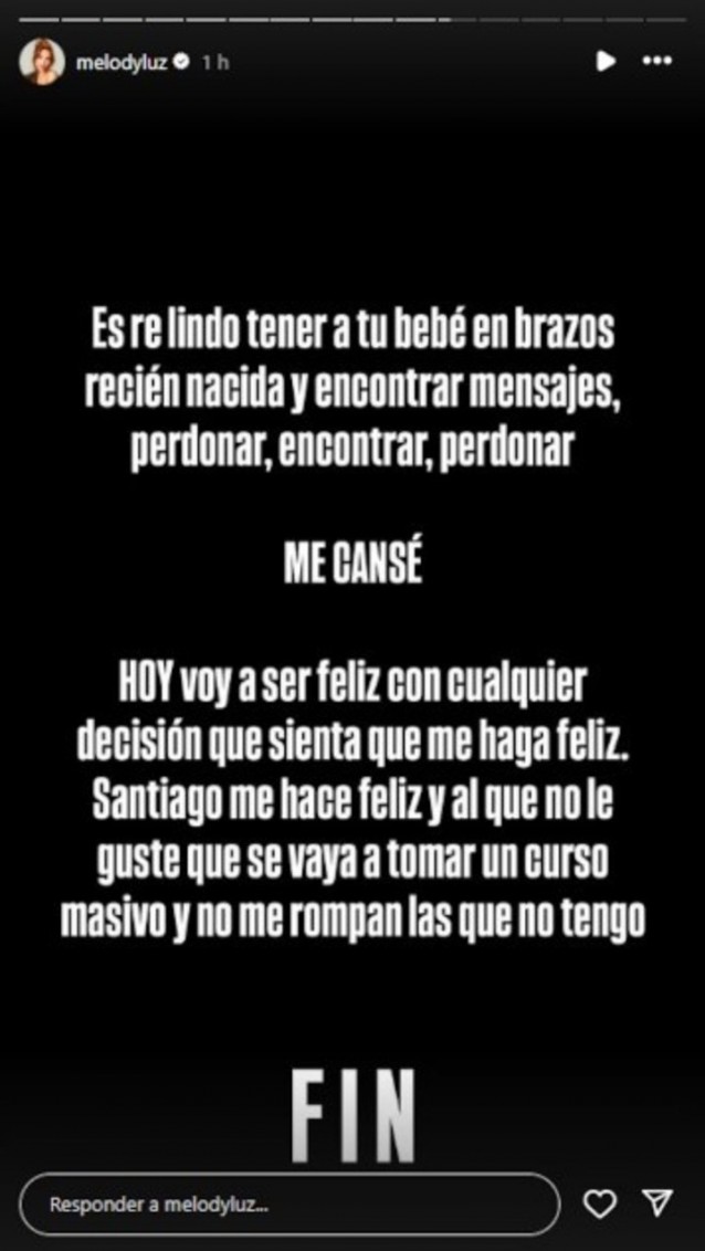 A continuación, Melody sentenció: “Me cansé. Hoy voy a ser feliz con cualquier decisión que sienta que me haga feliz”.