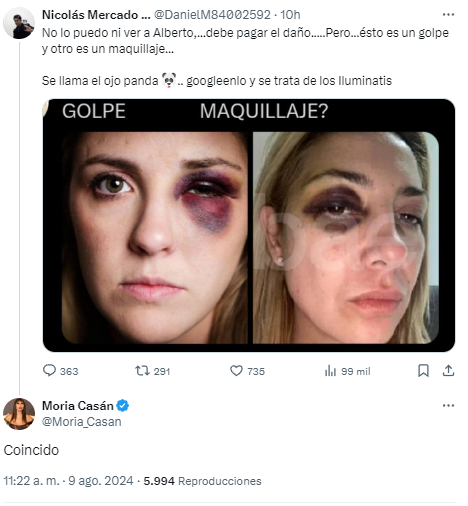 “No lo puedo ni ver a Alberto,… debe pagar el daño…. Pero…esto es un golpe y otro es un maquillaje... Se llama el ojo panda.. googleenlo y se trata de los iluminatis”, expresó una cuenta de X, a la que la ex vedette reafirmó en su respuesta: “Coincido”.