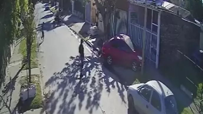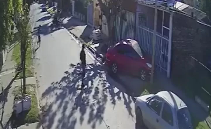 El hecho ocurrió en el Pasaje Vernet, en el centro de Merlo. En las imágenes, que fueron captadas por una cámara del lugar, se puede ver a un hombre en la vereda que usa su celular.