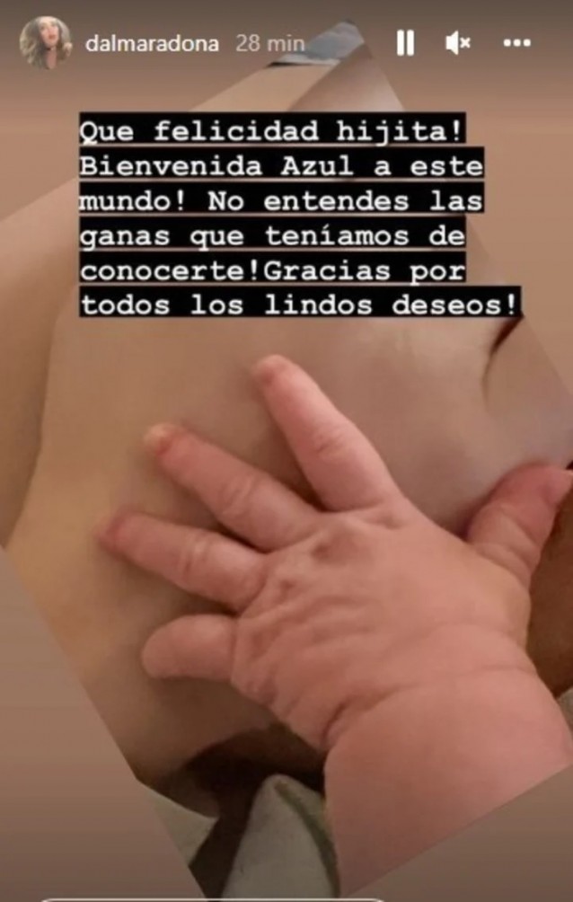“¡Qué felicidad, hijita! ¡Bienvenida Azul a este mundo! ¡No entendés las ganas que teníamos de conocerte! ¡Gracias por todos los lindos deseos”, escribió la hija de Claudia Villafañe y Diego Armando Maradona (1960-2020).