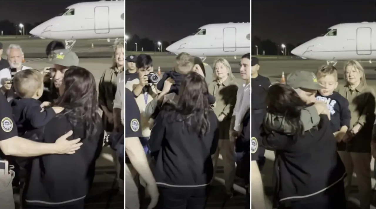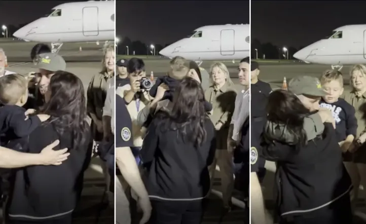 El gendarme argentino fue recibido por su madre, Griselda Heredia, esposa, María Alexandra Gómez, y su pequeño hijo. Gallo tuvo un emotivo reencuentro con su familia, abrazó a su hijo, al que tomó en brazos, y a su esposa.