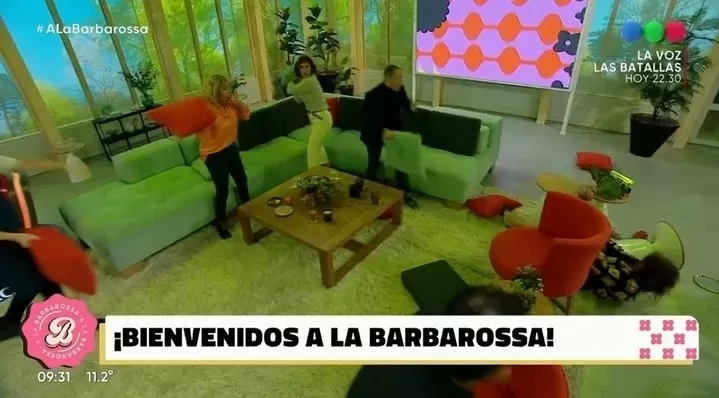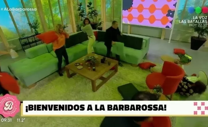 En detalle, Pazos estaba bailando con Georgina Barbarossa, la conductora del ciclo, y los otros panelistas (Paulo Kablan, Lío Pecoraro y Josefina Pouso) al ritmo de Todo el mundo está feliz, el éxito musical de la "Reina de los Bajitos", Xuxa, cuando comenzó la siempre divertida guerra de almohadones.